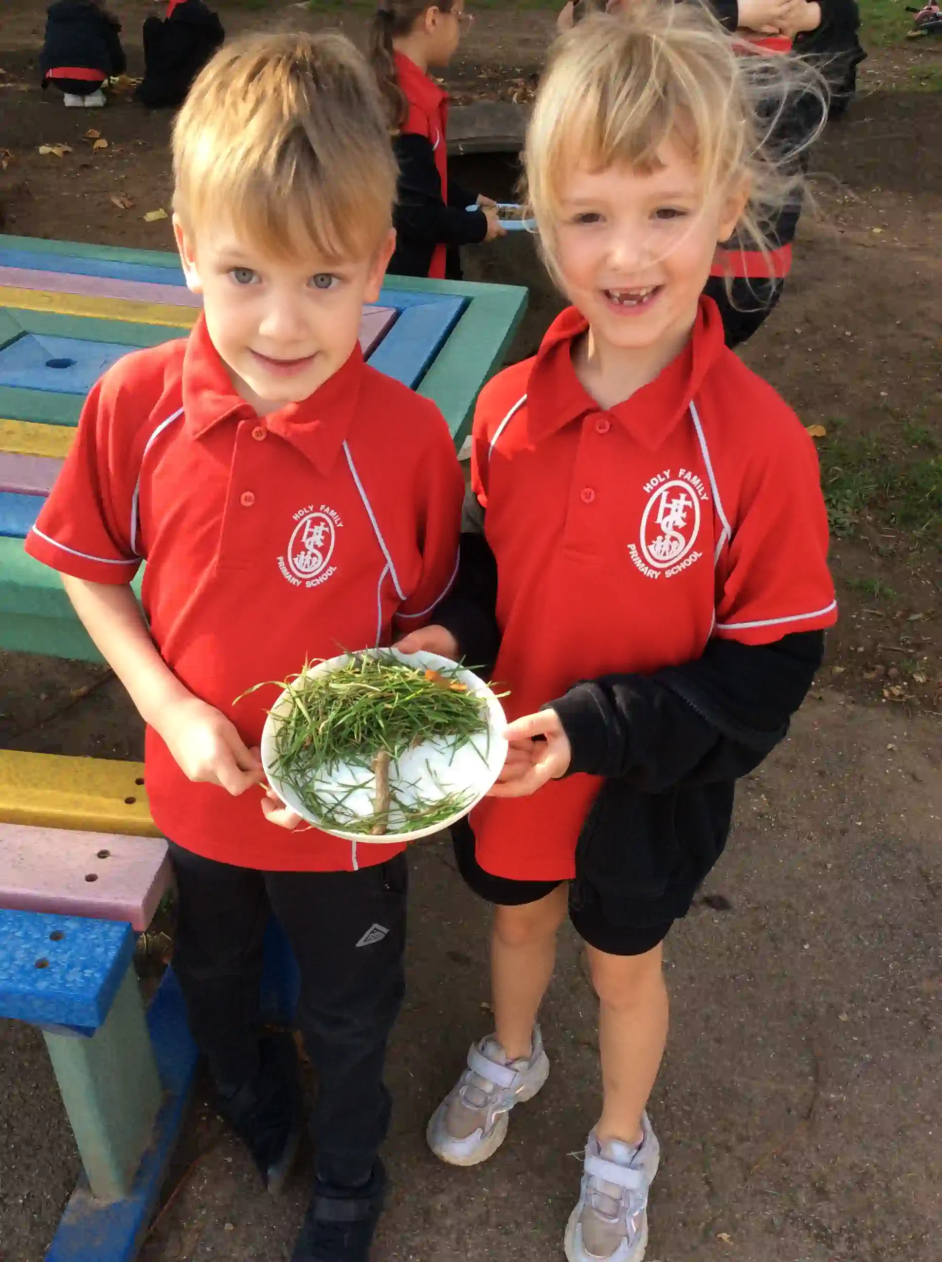 Nursery enjoyed their first Forest School session. We went to our outdoor classroom and learnt the rules of Forest School in order to keep ourselves and others safe. Then we got to explore. We looked carefully to see what was living in the pond, found acorns that we collected for the squirrels, rubbed and smelt a variety of herbs growing, explored under the trees and found a hole in the leaves that we think could be a hedgehog house.