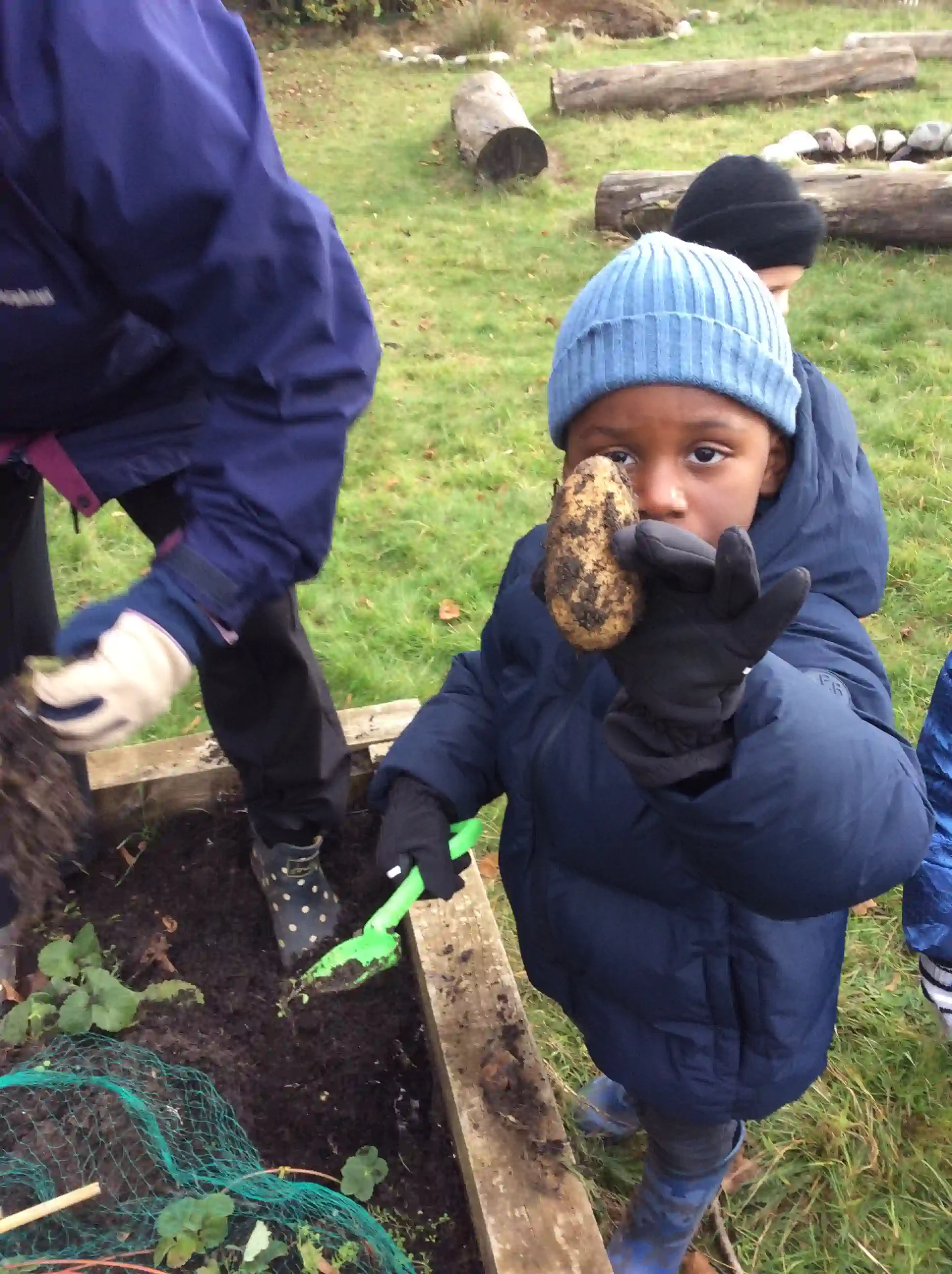 This week at Forest School Mrs Jewell (from gardening club) invited us to help her dig up her potatoes. All the children used trowels and forks to dig up the ground and found lots of potatoes in the soil. We talk about how potatoes grow under the ground from the 'tuber' not on the plant itself. Once we picked all the potatoes we took them back to class where we washed them, peeled and chopped them then microwaved them to make crisps. The children were amazed to see how the potatoe very quickly becomes a crisp when cooked.