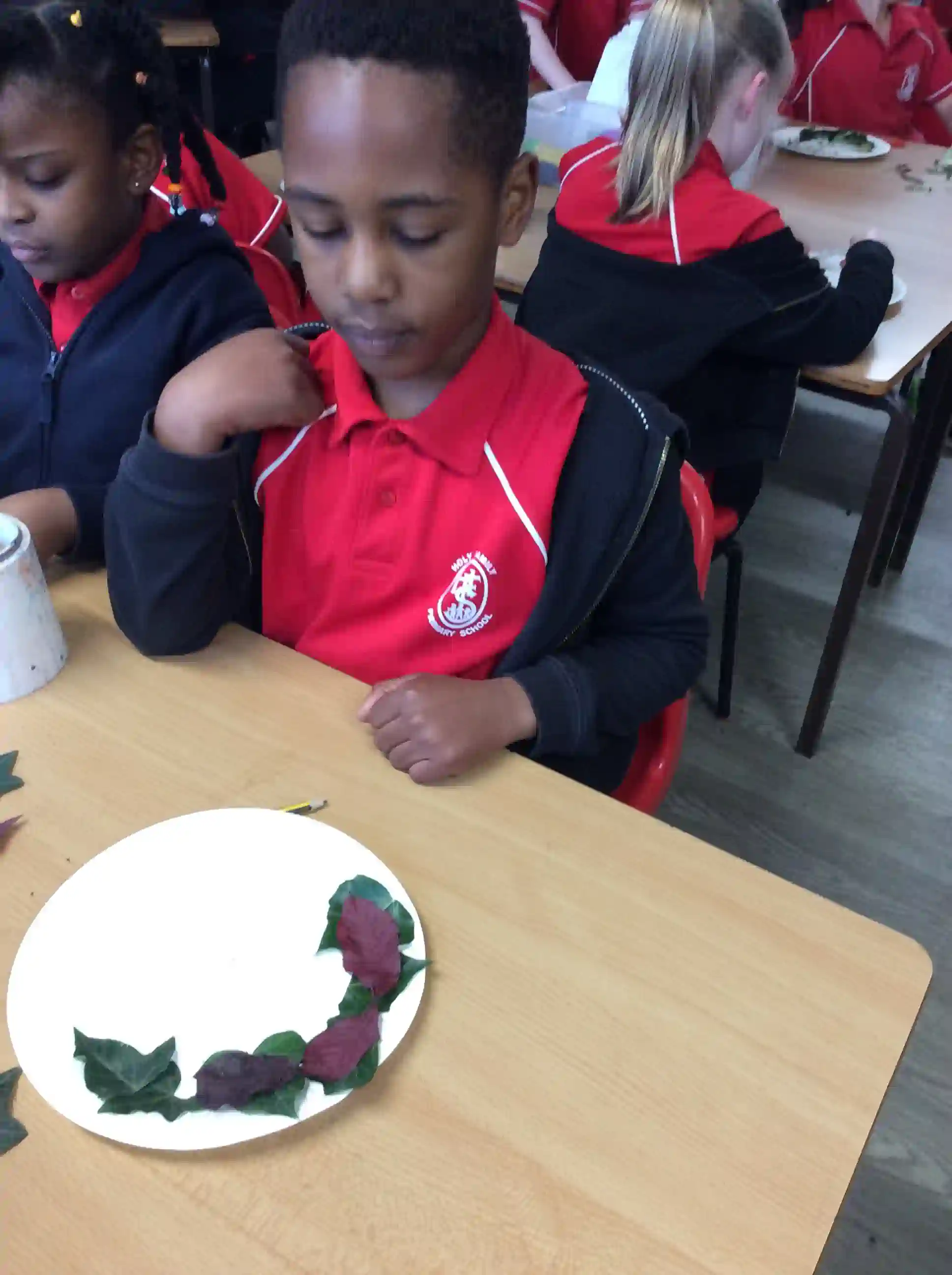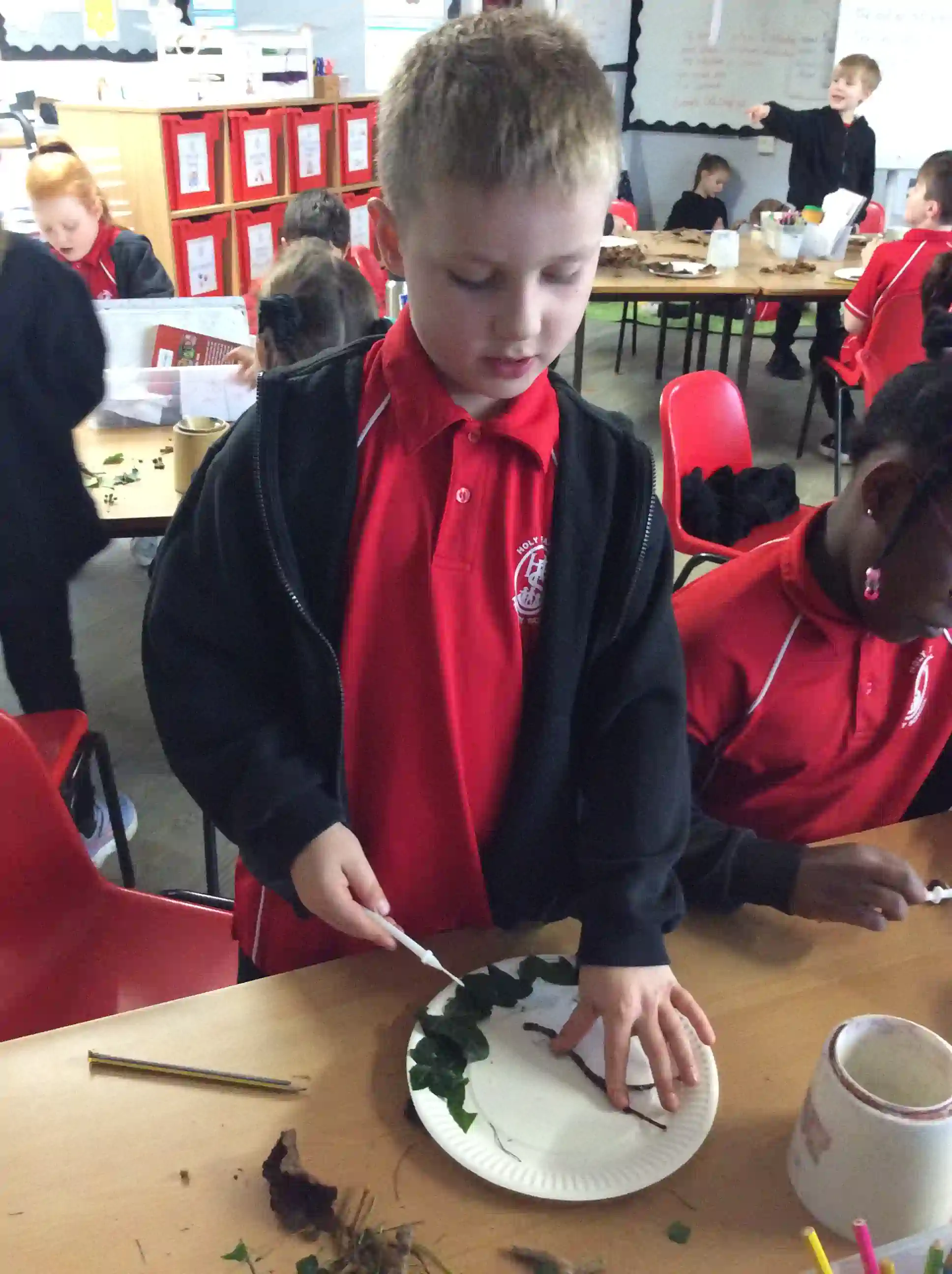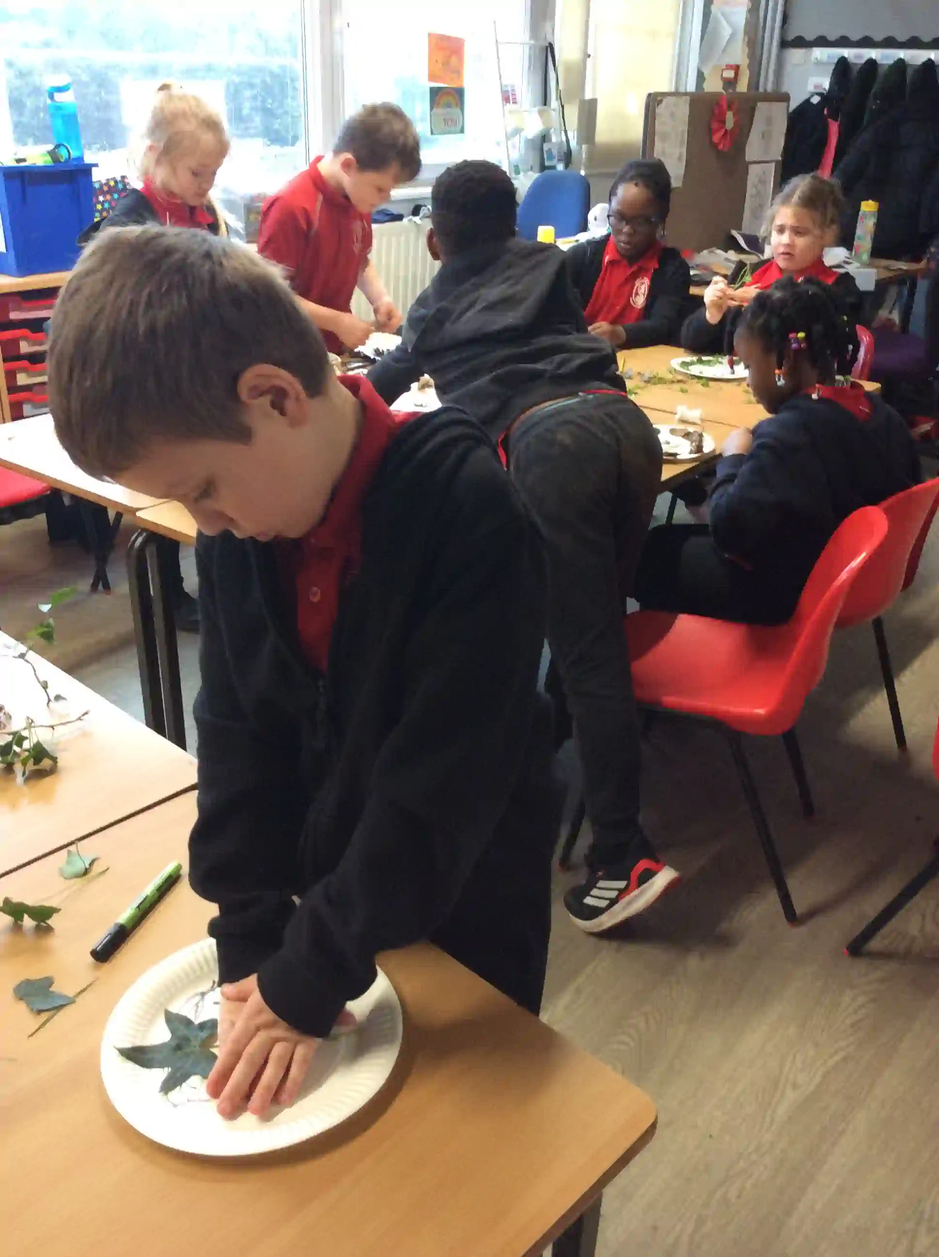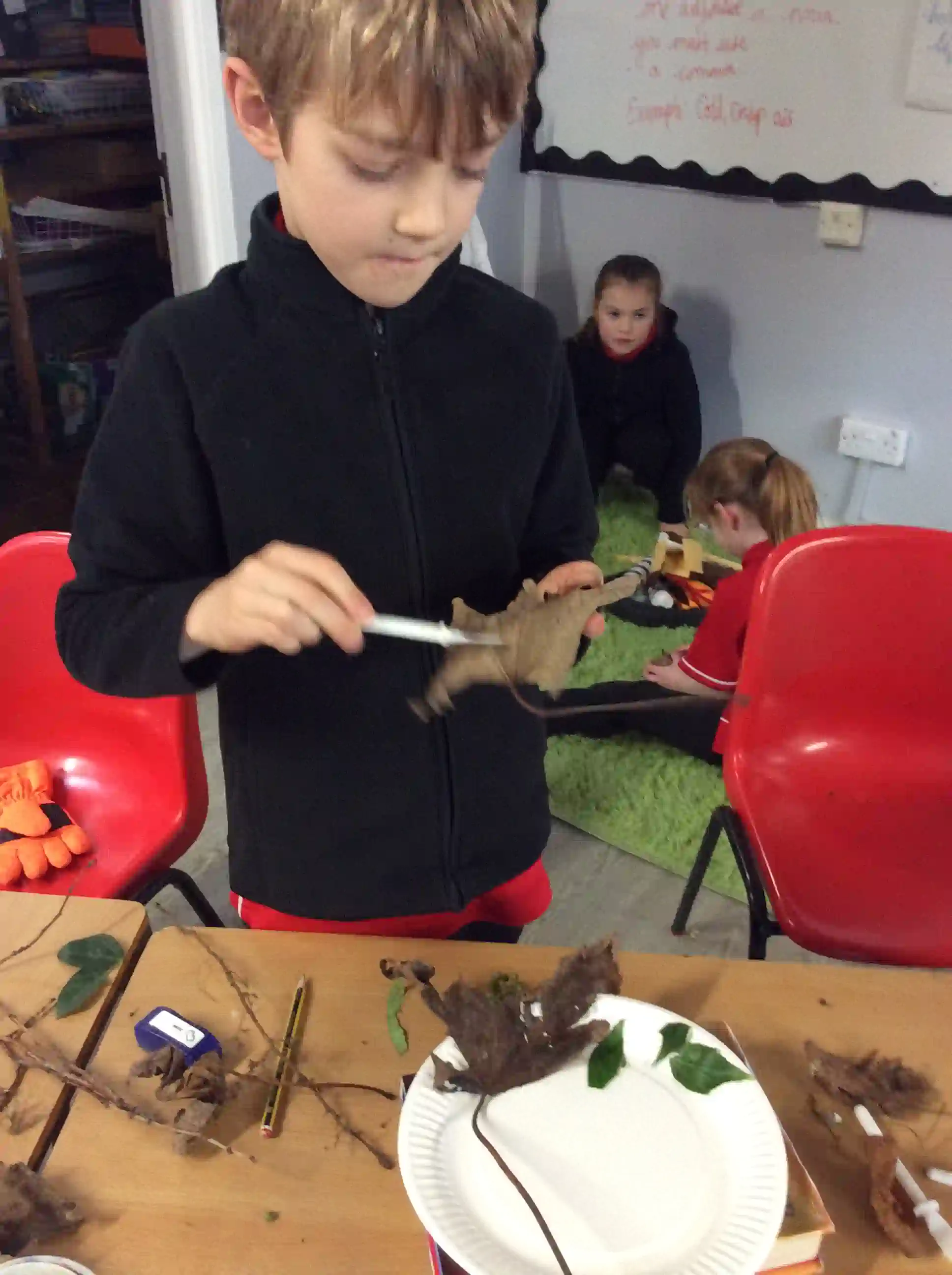 In this session today, we were celebrating friendship week/anti-bullying week by making kindness trees. We started with an empty tree template that was in desperate need of leaves to bring it back to life. The children foraged leaves from around the playground and wrote on them ways in which we can show kindness to other people such as sharing our resources and checking on people if they seem sad. We then filled our trees with kindnessl eaves.