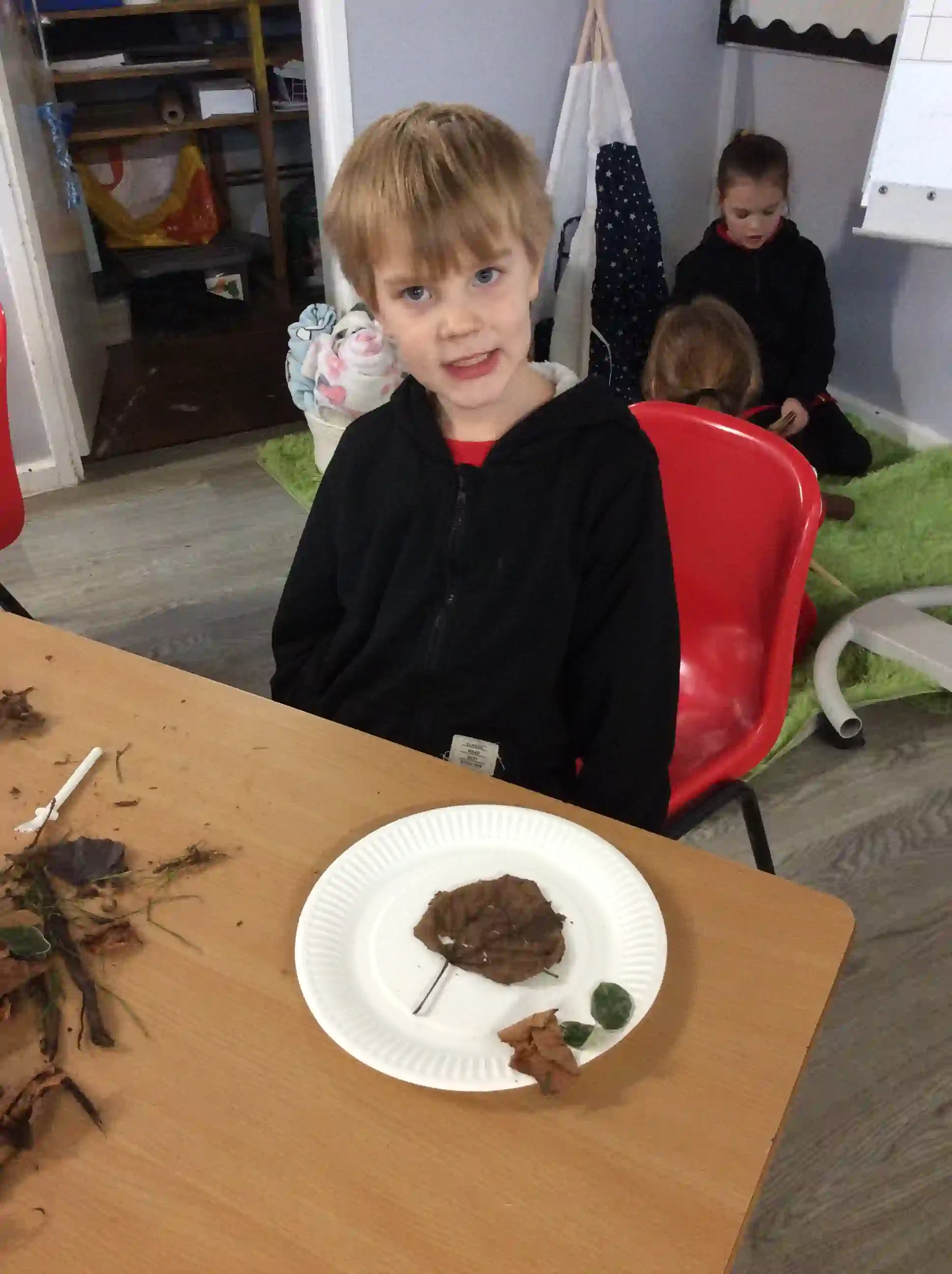 In LOTC today, firstly, we went through our safety rules for using our forest school as it’s a new half term. We then created our own self-portraits using natural materials. The children spent time outside foraging for materials such as leaves, acorns, sticks, berries, stones and more to use to create their own portraits. We took all of our foraged findings back to the classroom to compile our pieces of work. The children loved creating these.