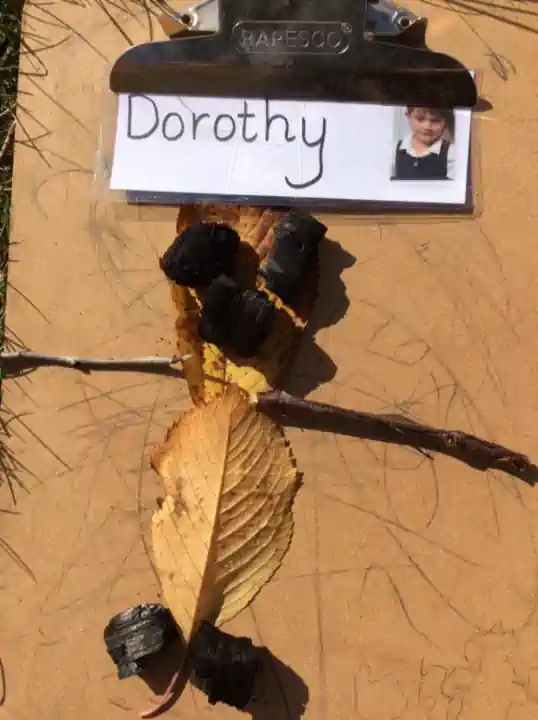 In LOTC this week we read the story Leaf Man. We stopped and looked at the pictures talking about how Leaf Man and the other characters were all made of autumn leaves. The children identified other autumn natural objects they could see in the pictures and what they had been used for. We then made our own Leaf Men by finding natural objects around Forest School for all the different body parts then created our own Leaf Man. The children had to think carefully about the shape and size they needed for each part e.g. a large round leaf for the head and two small objects for the eyes. Then they explained what they had used and why.