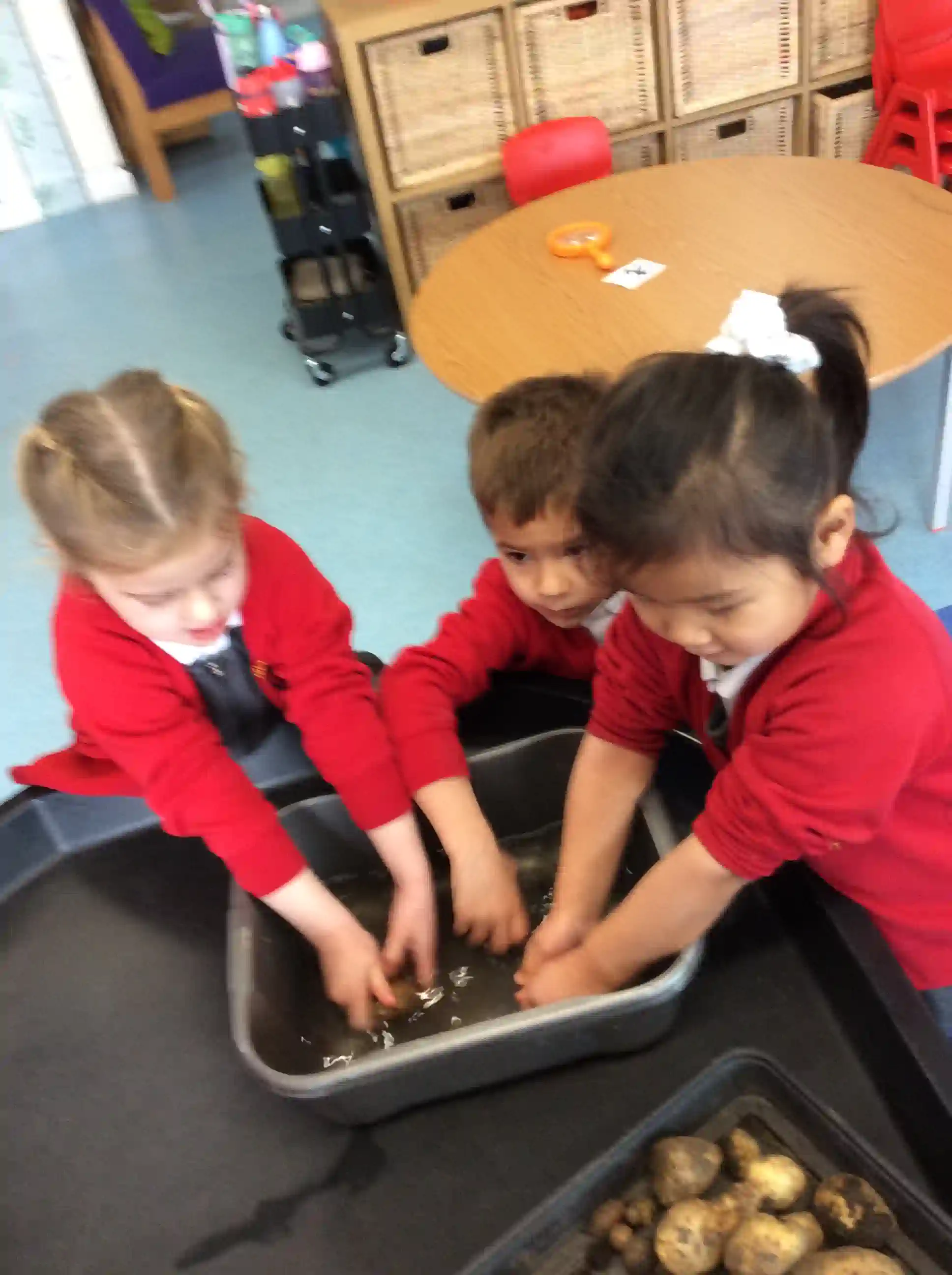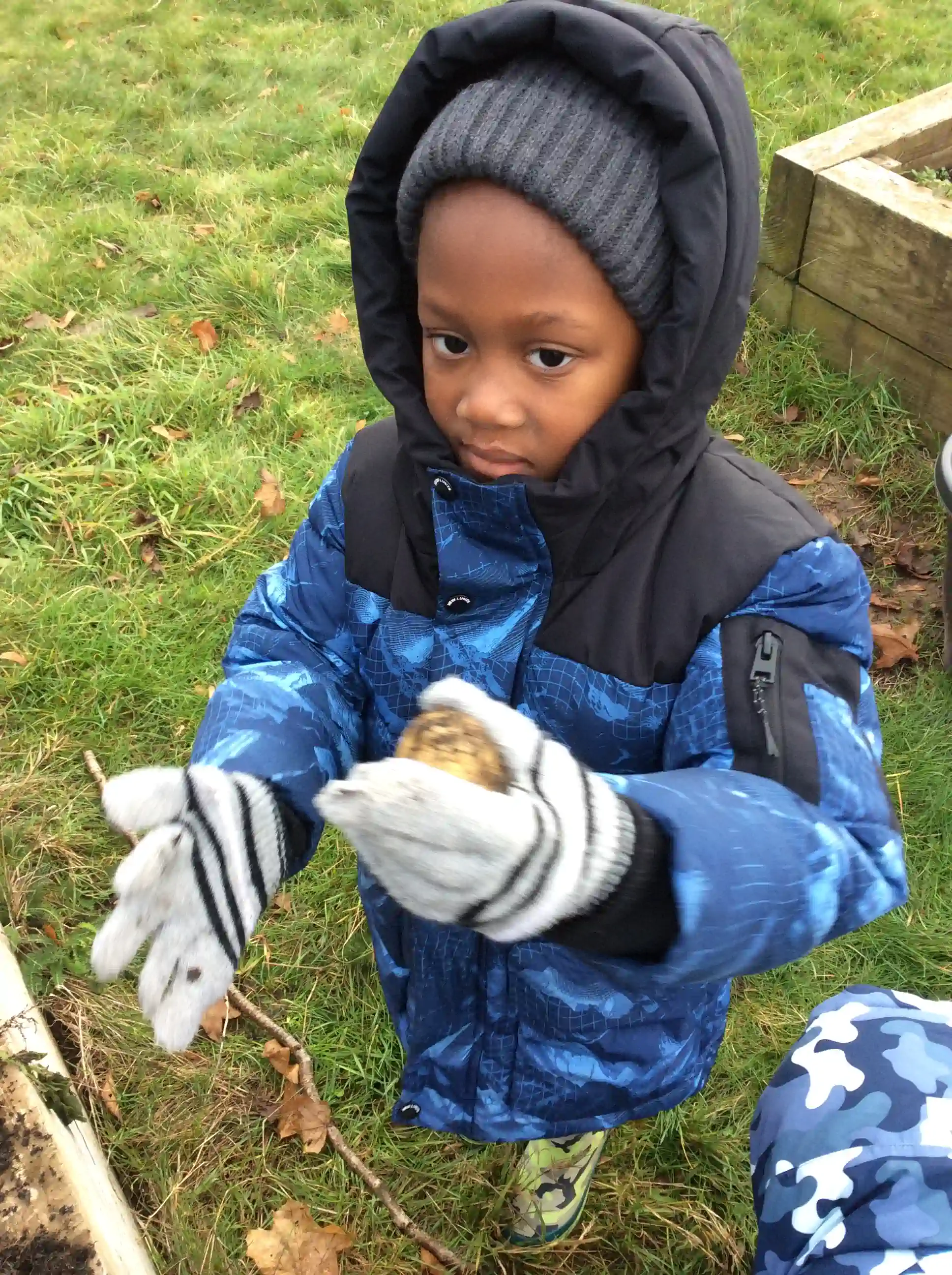 This week at Forest School Mrs Jewell (from gardening club) invited us to help her dig up her potatoes. All the children used trowels and forks to dig up the ground and found lots of potatoes in the soil. We talk about how potatoes grow under the ground from the 'tuber' not on the plant itself. Once we picked all the potatoes we took them back to class where we washed them, peeled and chopped them then microwaved them to make crisps. The children were amazed to see how the potatoe very quickly becomes a crisp when cooked.